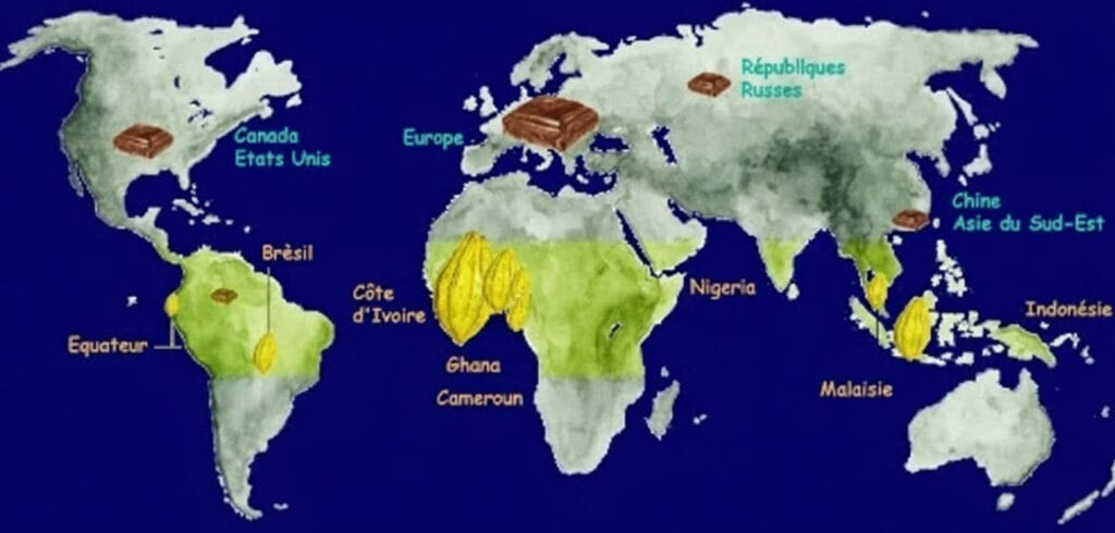 À l’origine, les fèves de cacao sont broyées puis diluées dans de l’eau et des épices. Du latin Theobroma cacao, le cacao “nourriture des dieux”, donnera naissance à ce que l’on nomme aujourd’hui chocolat. Le cacao est aussi une monnaie d’échange. Apprécié en Europe et en Amérique du Nord, le cacao se développe rapidement en Afrique et en Asie.